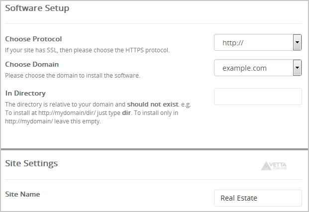 - In Directory: If you want to install this in a directory, for example example.com/directory, enter the directory name. Otherwise, leave this blank to install in your main domain example.com